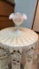 Material and Finish: The piece is made of custard or white satin glass with a matte finish. The top ruffled rim features a gradient from white to a light pink color.