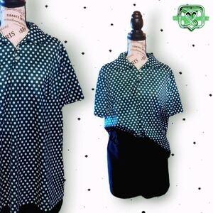 Vintage 1960's Funky Mod Polyester Green Polka Dot Shirt 2X plus size •No content tag. Feels/looks like iconic lightweight, stretchy, glossy 100% Polyester •white polka dots with dark green background •fold over collar •short sleeves •dpuble button Henley front •pullover •oversized fit Brand: unknown Size: estimated 2X, XXL, 2xl Decade: 1960-1970 Condition Grade: A, less than expected wear for age. No notable flaws. Please refer to measurement guide to ensure a perfect fit Bust 50 Waist 52 Length 29 Retrosaurusrex Vintage; vtg; 70s 60s, Blouse, shirt, top, mod; button down; lounge lizard, clutter, cluttercore, casual; summer; retro; quirky, funky, indie; grunge, rockabilly, pinup, plus size, volup, curvy, costume, Rosie the riveter