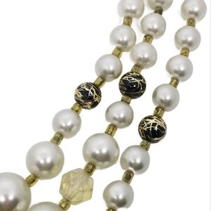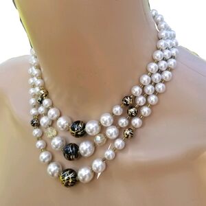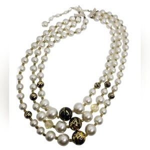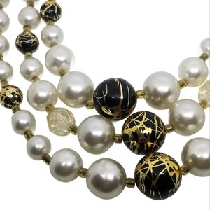 Lovely vintage necklace circa. 1950s-60s. Necklace consists of three layers of faux pearls and black with metallic gold acrylic beads. Necklace is collar length and measures 15 inches across with a 3 inch extender chain. Necklace has a hook clasp stamped Japan, piece is in great condition.