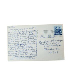 Up for consideration is a vintage 1960s postcard titled "A Friendly Game of Black Jack" featuring art by Crosby DeMoss, originally distributed by the Dunes Hotel in Las Vegas, Nevada. The back includes a handwritten message and a blue 5¢ George Washington stamp (Scott #1213), postmarked March 28, 1966, and mailed to Alexandria, Virginia. A fun and nostalgic piece of mid-century ephemera that captures the spirit of travel, Vegas, and personal correspondence from the era. Great for collectors of vintage postcards, Nevada history, or postal memorabilia.