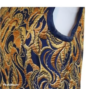 This is an absolutely gorgeous Malcolm Starr dress, jacket, and belt. The star of this show is the amazing fabric, featuring hues of gold and copper swirling over a navy base. The jacket and skirt are trimmed in a corresponding blue silk satin border. The dress has a classic a-line cut that is all Mid-century Malcolm Starr. The matching long-sleeved jacket is a boxier cut, a double row of buttons down the front in blue, and a perfect little collar. Just a gorgeous set!