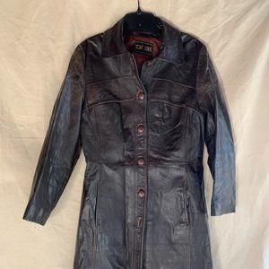 Dark brown tailored real leather midi-length coat with clean burgundy lining. Authentic vintage – "distressed" and laidback. Looks cool as a topcoat over jeans & sneakers, take it "Ali MacGraw" over something preppy, funk it up with bellbottoms & platforms, or rock it as boho-chic over a floral dress with booties. Yes, there is wear on the upper back but the patina gives it character & tells a story. It just gets better with age (& some leather care/TLC). Slash pockets, covered buttons.