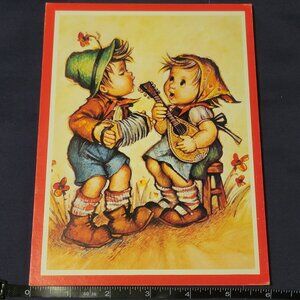 VINTAGE 1970s EVANS HUMMEL LITHOGRAPH MOUNTED ON CHIPBOARD. LITHOGRAPH DEPICTS A BOY PLAYING AN ACCORDIAN AND A GIRL PLAYING A MANDOLIN AND SINGING. 8 INCHES X 6 INCHES. THIS PIECE IS VINTAGE FROM THE 1970s. LITHOGRAPH IS MOUNTED ON CHIPBORAD. THERE IS A SPOT OF DRIED GLUE ON THE BACK. THE FRONT HAS MINOR WEAR AS SHOWN IN PICTURES BUT IS IN GOOD CONDITION FOR ITS AGE. SMOKE FREE AND PET FREE HOME.