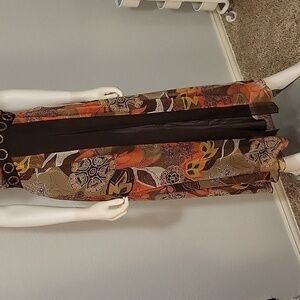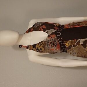 100% Silk. Lining is 100% Polyester. Padded bra. Wood circle trim.