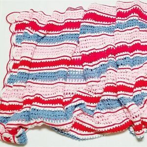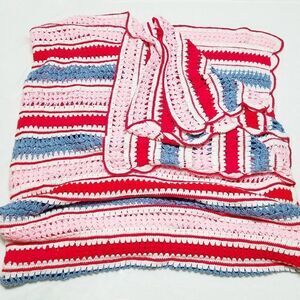 Vintage 1970s King Size Pastel Blue Pink Crochet Striped Afghan Comforter.