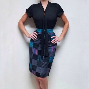 Vintage 1970s Ms. Interpret Black Neck Tie Patchwork Pencil Skirt Belted Outfit.