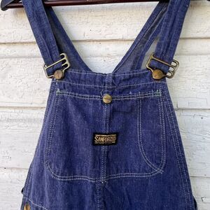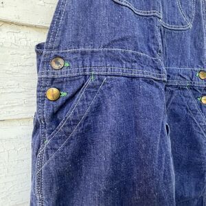 Excellent vintage pair of union made overalls! 100% cotton denim. Only flaw is very small hole pictured on one leg. No other flaws. Very rare original Sanforized. I am a size 6 in jeans and these fit me perfect. Measurements in photos.