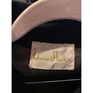 Embrace timeless elegance with this classic black double-breasted skirt suit by Vera Hicks from the 1970s. This true vintage piece is made of an acrylic blend material and features a chest size of 18 inches, waist size of 16 inches, and a hip size of 21 inches. The waist-to-hem length is 24 inches and the shoulder-to-hem length is 26 inches, making it a medium size that's perfect for business occasions.