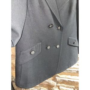 Absolutely stunning and classic black women’s double breasted suit. Beautiful, unique buttons, classic collar buttons on the sleeve. Satin lining custom made by vera Hicks and Ernst Strauss.