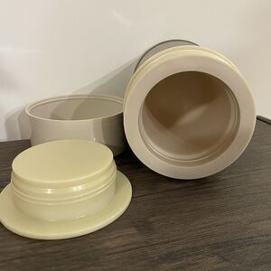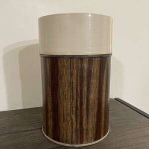 This is a vintage Thermos from the 1970s with a wood grain look on the outside. The outside is made of metal, and the inside is made of plastic. It was manufactured by King Seeley in the United States. The Thermos has a capacity of 10oz and is designed for both hot and cold beverages. The cup is model # 73A63, the stopper is model # 763, and the filler is model # 70F. It is in great preowned condition.