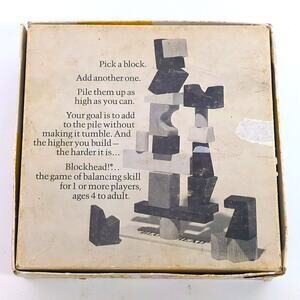 This is a pre-owned, vintage BLOCKHEAD! balancing skill game from 1975, made by Parker Brothers. The game comes in its original box and is a fun, classic tabletop challenge for all ages.