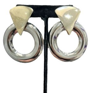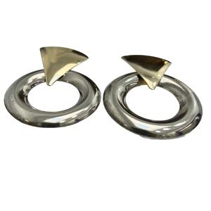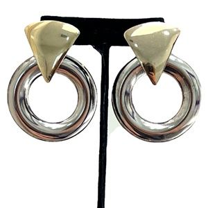 Vintage 1980's gold and silver tone door knocker earrings. The top is a gold tone triangle. The bottom is a raised silver tone circle. The top and bottom are connected with a wire that allows for movement. There are some scratches on both pieces and a little discoloration on the silver. This is all from wear and age. See photos. Overall, in good preowned condition.