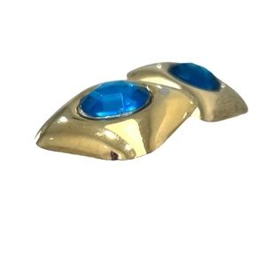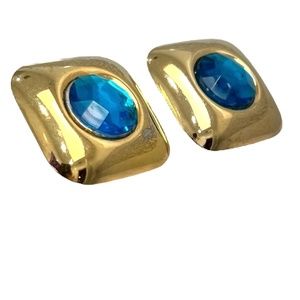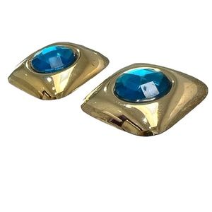 Vintage 1980's shiny gold tone square with blue faceted stone center earrings. The squares have rounded edges and the whole earring is slightly concave so the center blue stone stands out. The center stone could be plastic or resin or something else. It is a very bright blue. The facets reflect the light beautifully. The blue is 7/8" across. There are some scratches from wear and age. Very lightweight. Still a statement pair of earrings! In very good preowned condition.