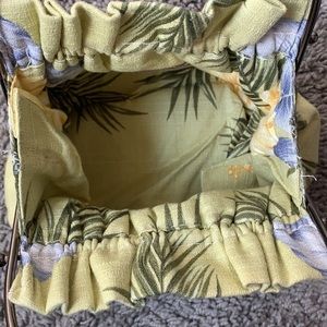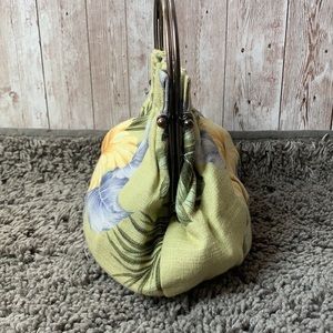 Beautiful. Clean. Flawless vintage clutch. Green color with white flowers. Barkcloth material. Kiss lock. No pockets.