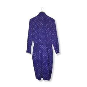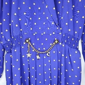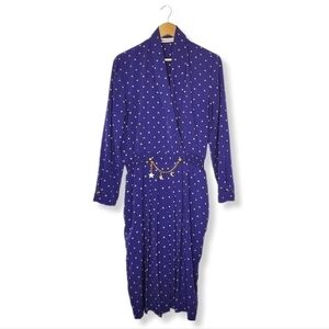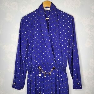 VINTAGE 1980s Blue Gold Dot Long Sleeve Wrap Dress with Gold Charm Accents 14