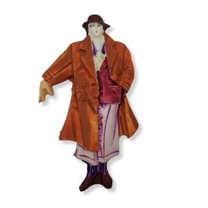 Unique vintage brooch made of polymer and depicts a woman wearing 1980s high fashion. Brooch measures 3-1/4 inches tall and 2 inches wide. Great condition.