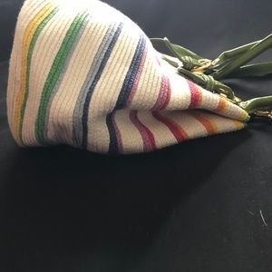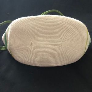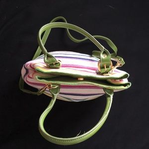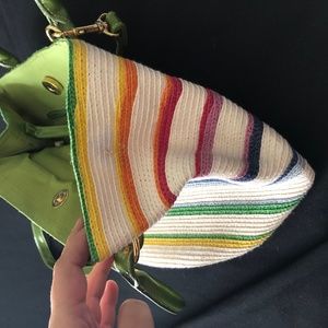 White wicker/straw type purse with horizontal stripes in a rainbow of colors; green trim handles/interior