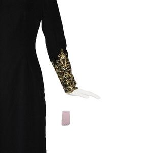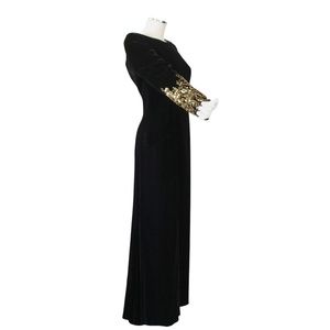 This stunning 1980s Victor Costa gown is a true vintage gem. Crafted from soft black velvet, this gown features intricate gold sequin designed embellishment that elegantly adorns both sleeves. The deep v back adds a touch of drama, while the long-sleeved design keeps it demure. With its floor length silhouette, this dress is perfect for any formal occasion. A true statement piece, this Victor Costa creation is such a chic option for any event. This gown still bears the original sales tags.