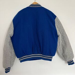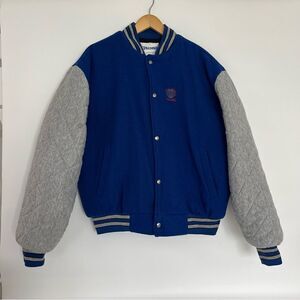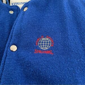 Heavyweight insulated bomber jacket with ribbed collar, cuffs, and waist. Blue body, gray sleeves, pop-button front, and the Spalding globe logo embroidered on the chest.