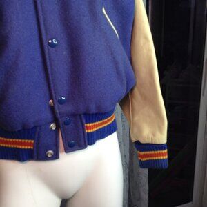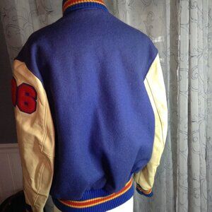 VINTAGE 1984 DeLong Sportswear Varsity Golf Letterman Jacket; Leather and Wool. Personalized! Which is removeable. Size 40 with Leather Sleeves, Made in the USA, Wool with poly lining. Some very small holes, mostly undetectable (on back). Otherwise, in Terrific condition for age. Leather is still supple. Great for the gold enthusiast. Shoulders: 19.5", Pit-pit: 24". Waist: 16" (stretchy/wool), Length: 25". Little signs of wear, nothing unusual for the age.