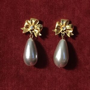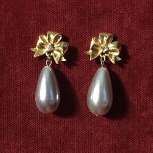 Beautiful silver gray simulated pearl drop earrings topped by gold-tone ribbon and rhinestone. Approx 1.5” long. Purchased in late 80s when I was a consultant for Avon. Worn just a few times. ❤️