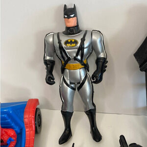 Great collector set for any Marvel and DC Comic fans! Most items are vintage Happy Meal Toys. One Batmobile has a release that shoots the car forward. The Batman figure has a detachable expandable wing backpack.