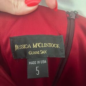 Vintage 1990s Jessica McClintock Dress. I wore this to my Homecoming Dance. Such a beautiful burgundy shimmer fabric and boning in torso. A few pulls, the most noticeable ones pictured.