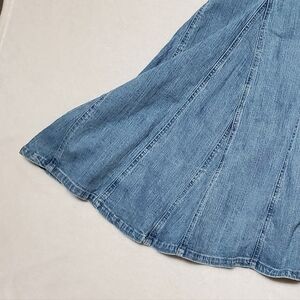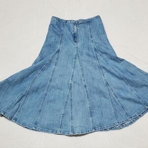 Vintage 1990s Light Wash Stone Wash High Rise Stretchy Midi Denim Panel Skirt.