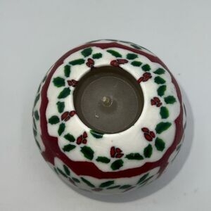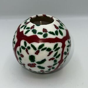 White wax ball candle with green and red Holly Berry design. Never burned. Excellent condition . Measures 4” across and 4.5” tall.