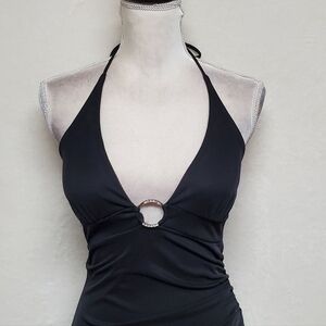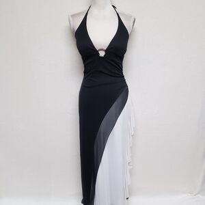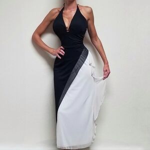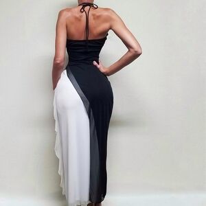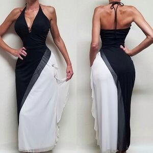 VINTAGE 1990s Taboo Black White Ruffle Asymmetrical Backless Halter Maxi Dress