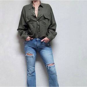 Vintage 1990s Tommy Hilfiger Army Green Linen Unisex Button Up Long Sleeve Shirt.
