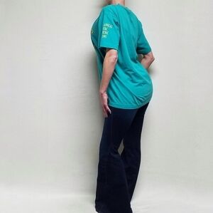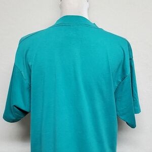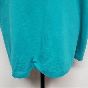 Turquoise crewneck with short sleeves sleeves and single stitch.