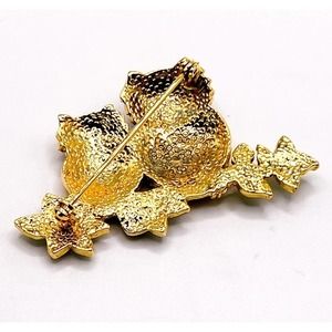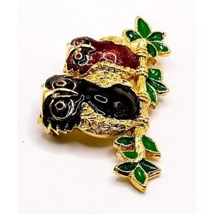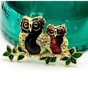 VINTAGE 2 Owls On Branch Pin Gold Red Black Enamel Bird 2.25in