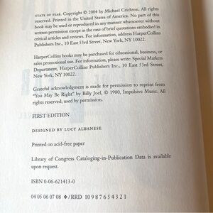 Dive into a thrilling adventure with this First Edition of State of Fear by Michael Crichton, published in 2004 by HarperCollins. This techno-thriller blends scientific fact with high-stakes action, making it a must-have for Crichton fans and collectors alike.