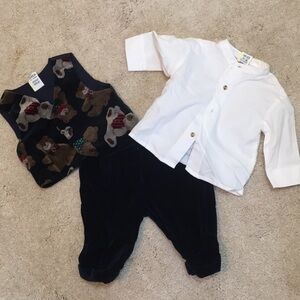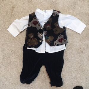 Vest velvet with Bear print and button front. Shirt is collarless and button front. Pants have elastic waistband and are cuffed. They are also velvet. All in excellent condition and don’t believe have ever been worn. Any baby boy will look like a doll❤️