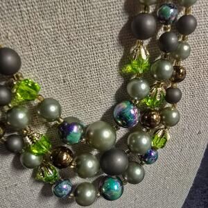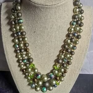 Jewelry 3 strand iridescent bead & faux pearl necklace with matching clip on earrings VINTAGE