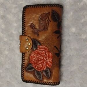 vintage hand toled RAR roses are red wallet with a deer and multiple roses very beautiful artwork and very good craftsmanship is in excellent condition still has original pen that came with it and has two separate coin holders inside that are snap together so you don't lose any change. size is 7.5 in wide.