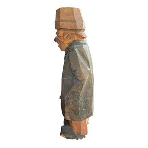 Vintage Trygg flat-plane hand-carved wood figure of old man in a coat (perhaps an old sailor), believed to have been carved by the patriarch of the family, C. J. Trygg. This is definitely a signed Trygg carving; and based upon a signature comparison to known C. J. Trygg carving and carvings by his sons, C.O. Trygg and Lars Trygg, it appears to be one of the elder Trygg's carvings. C.J. Trygg died in 1954, and many of his carvings similar to this one were done in the 1930s.
