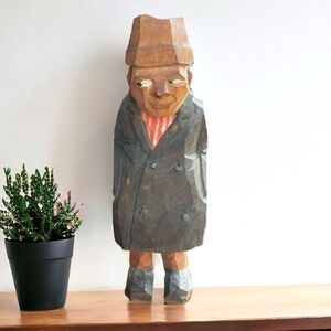VINTAGE 5" CARL JOHAN TRYGG WOOD CARVING • OLD MAN WEARING COAT • SWEDEN