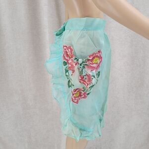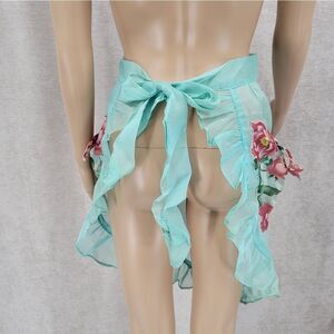 Beautiful sheer light teal blue with ruffled edges and gorgeous floral pockets. Has some staining on one of the ties.