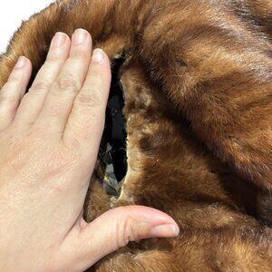CONDITION/NOTICE OF FLAWS: Needs repair to the hide where the collar meets the back piece. The lining must be re-attached to the hide at the upper part of the torso and sleeve openings. Buyer will need to take the coat to a furrier to have it properly repaired and conditioned.