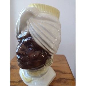 Royal Copley head vase that is also a wall pocket.in the classic Blackamoor style, this vase depicts a Mid-Eastern Prince wearing a turban and an earring in his left ear with a high gloss glaze. Royal Copley, appears in raised letter script on the back. The vase stands or can be hung on the wall. There is a hole on the back side for hanging