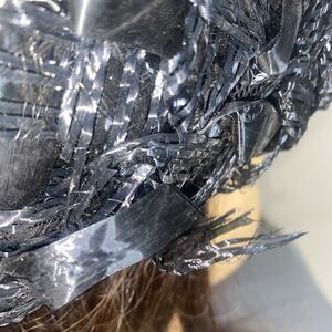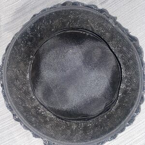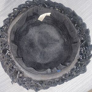 Very unique. Black all over. Mesh base with plastic feeling material woven around the tribes up brim. Gathered fabric around the crown.