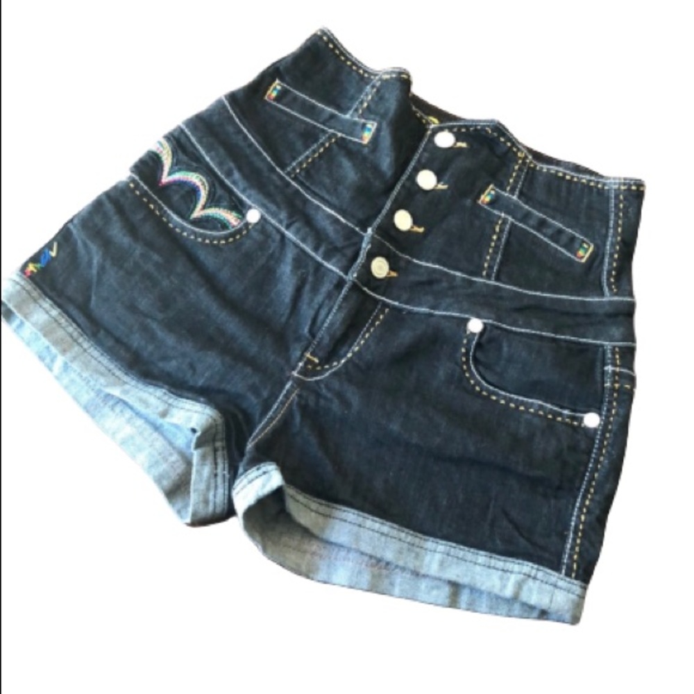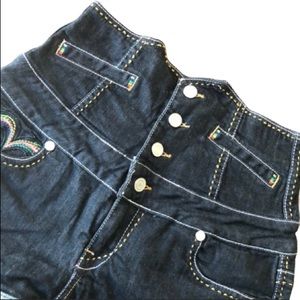 High waisted denim shorts with multi colored embroidered stitching! Fabulous detailed stitching, make these true eye candy!