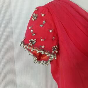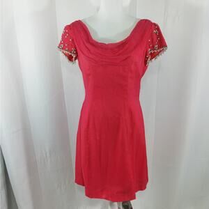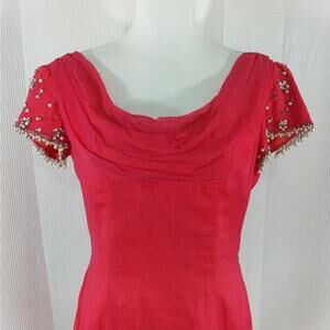 A fabulous vintage find! This awesome persimmon pink dress is circa the 1960's, from Mays Boutique! In chiffon and satin, it features a draped neckline and hand JEWELED sleeves! Gorgeous! Size 16, back zipper, lined! (Please check measurements, as VINTAGE sizes vary!) *Note: one discolored spot at left front near underarm, Otherwise: Guaranteed excellent vintage condition by @HauteClub!