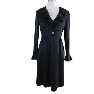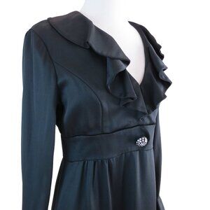 VINTAGE 60s 70s Women's Mod Black Satin Cocktail Dress w/ Ruffle Collar & Cuffs