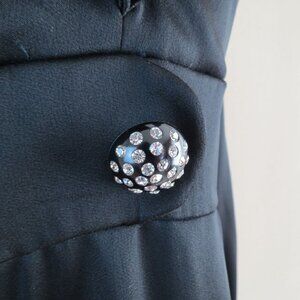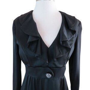 • black satin cocktail dress; deep v-neckline with dramatic ruffle collar; faux belt waistline with decorative rhinestone button; long slim sleeves with ruffle cuffs; slim skirt gently gathered from the waistband; metal zip and hook & eye closures at center back