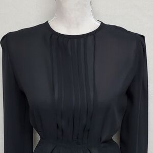 Black semi-sheer blouse with a high neckline and and a full button back.