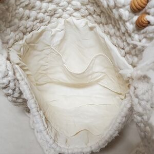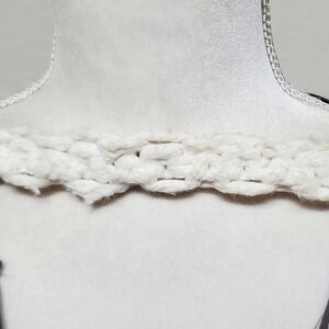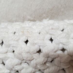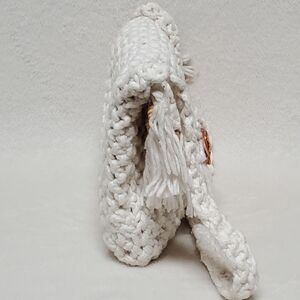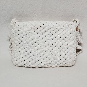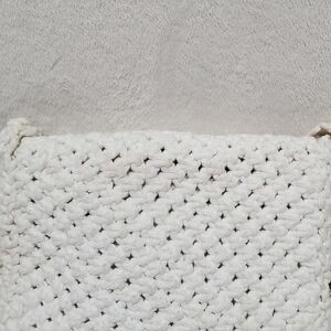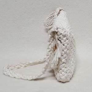 White crochet knit, light spots can be removed by someone more professional than me, with a long crochet crossbody strap.