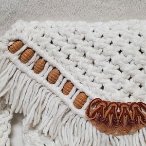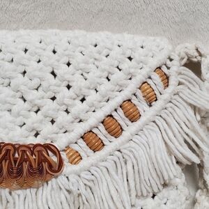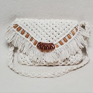 VINTAGE 60s Large White Crochet Wooden Beaded Whicker Eye Fringe Crossbody Purse